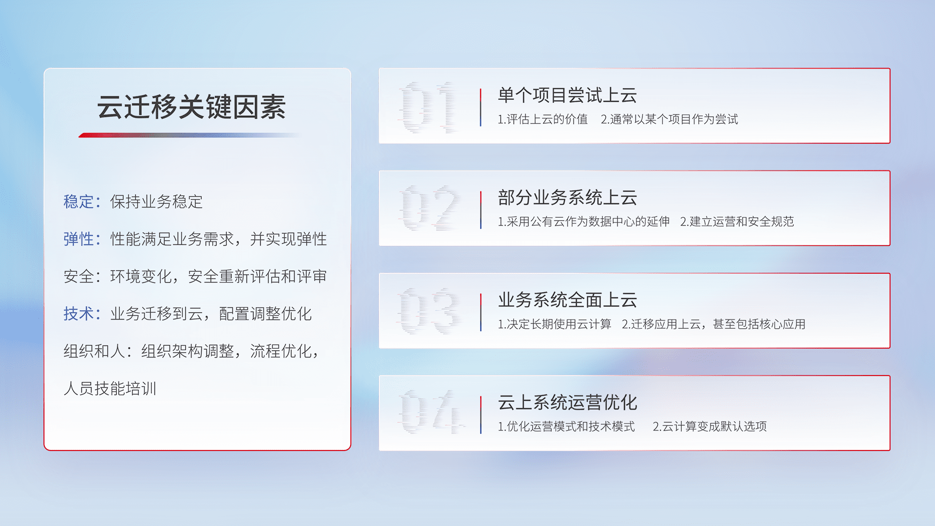 结合实际业务,,,从规划设计、、、云平台选型、、、、云原生改造、、数据迁移、、、集成交付,,迁移全过程为客户识别最佳上云路径,,做好风险识别管理,,,设计网络架构、、身份权限、、、安全审计合规、、、、操作审计、、、、日志审计、、监控告警策略、、、多站点容灾设计等,,,对云上基础设施进行整体规划,,提升IT治理水平,,,,以满足弹性、、、高可用、、、高性能的需求。。。。